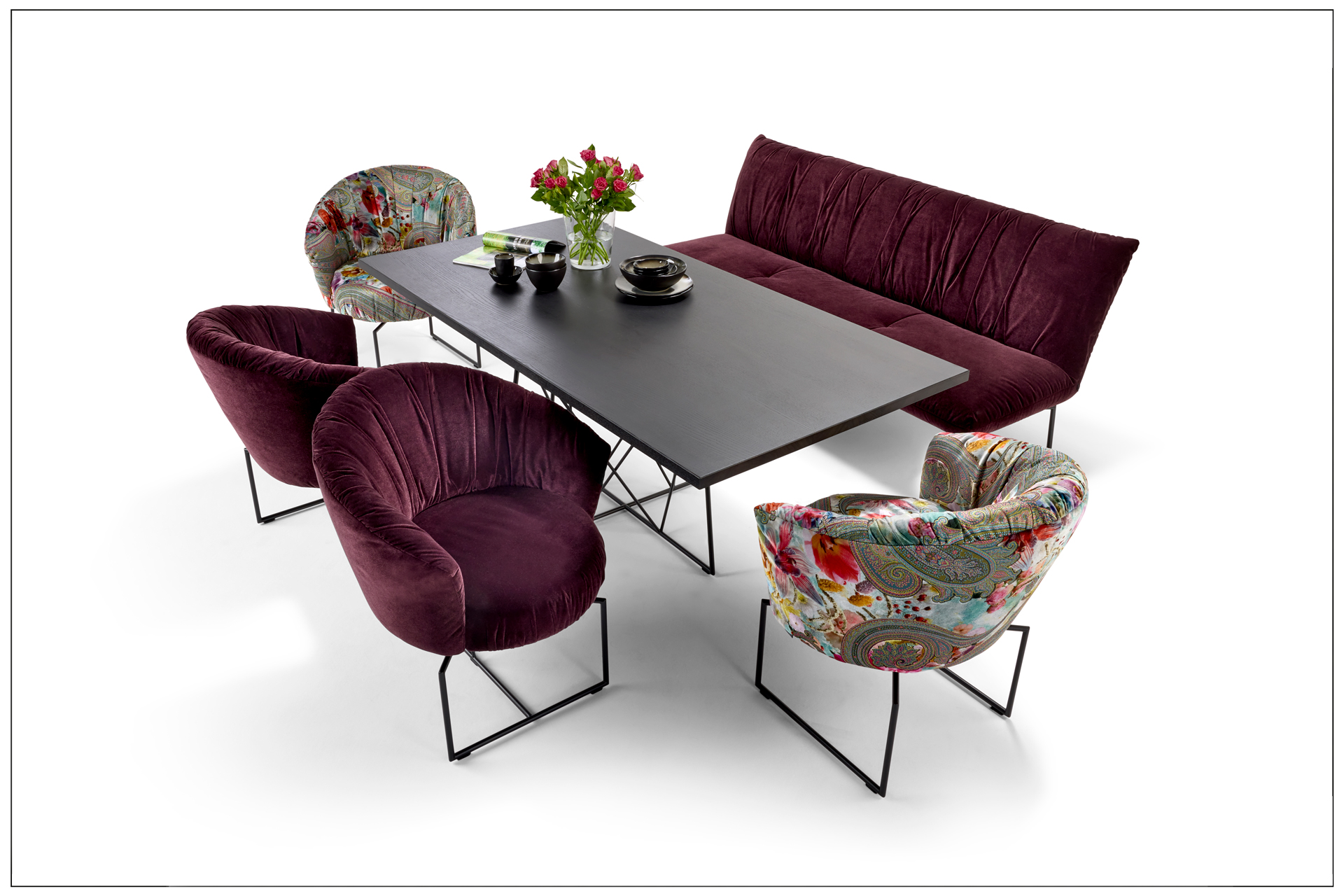 DINING LUXERY. DESIGN, COMFORT AND OPULENCE. SWIVEL SEATS WITH THE ARMREST COMFORT OF AN ARMCHAIR IN COMBINATION WITH THE DECORATIVE DINING SOFA, AS WELL AS TABLES MADE OF SOLID REAL WOOD AND GRACEFUL STEEL DESIGN. MATERIAL, FUNCTION AND CRAFTSMANSHIP FROM ONE MOULD. CHARMINGLY SEDUCTIVE TEXTILES OF THE BEST QUALITY, OR A SELECTION OF OUR LEATHER COVERS STAND FOR THE SPECIAL BULLFROG COUTURE. SIMPLY OWN, FEEL GOOD AND ENJOY. A TRULY CREATIVE PRODUCT FROM BULLFROG.