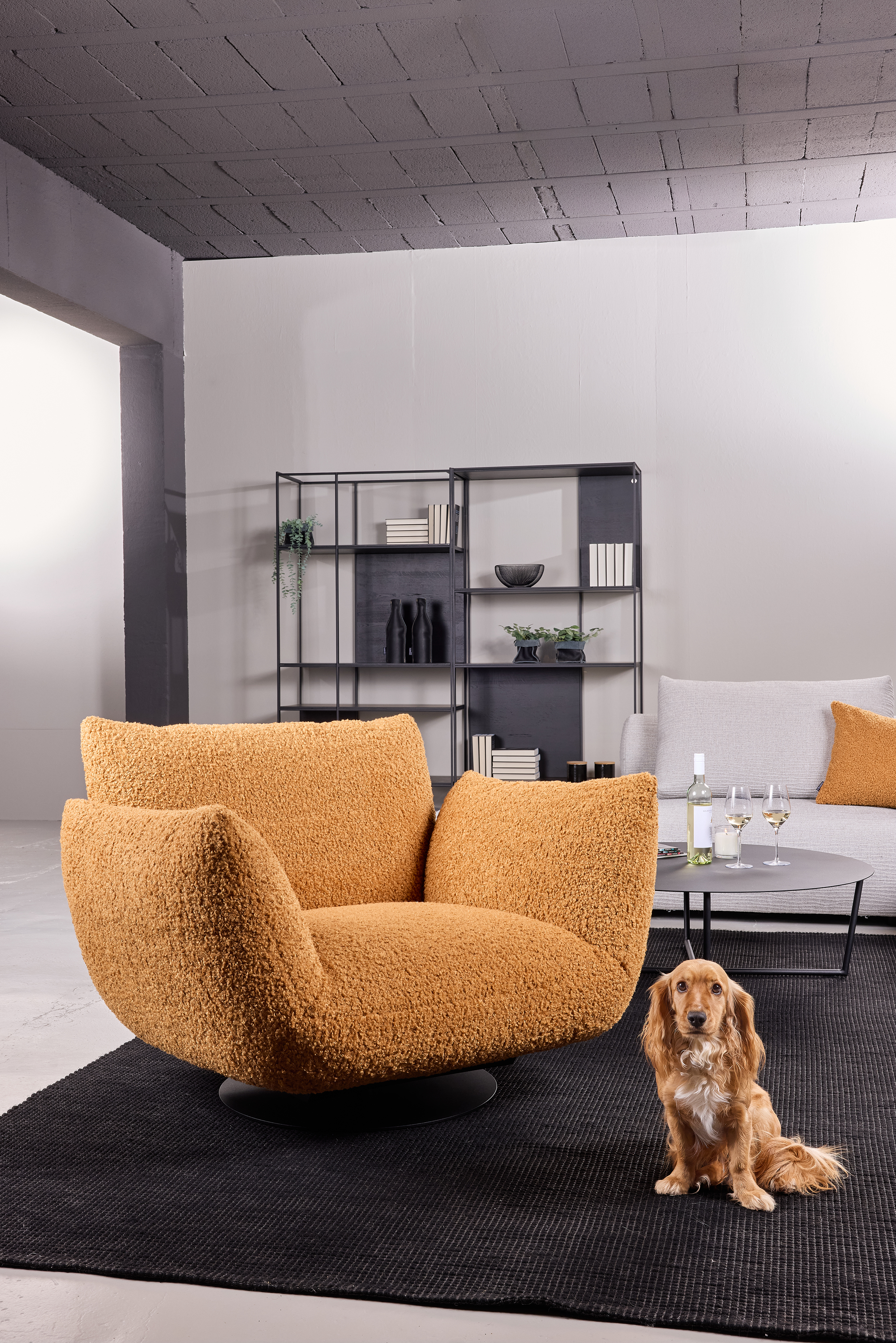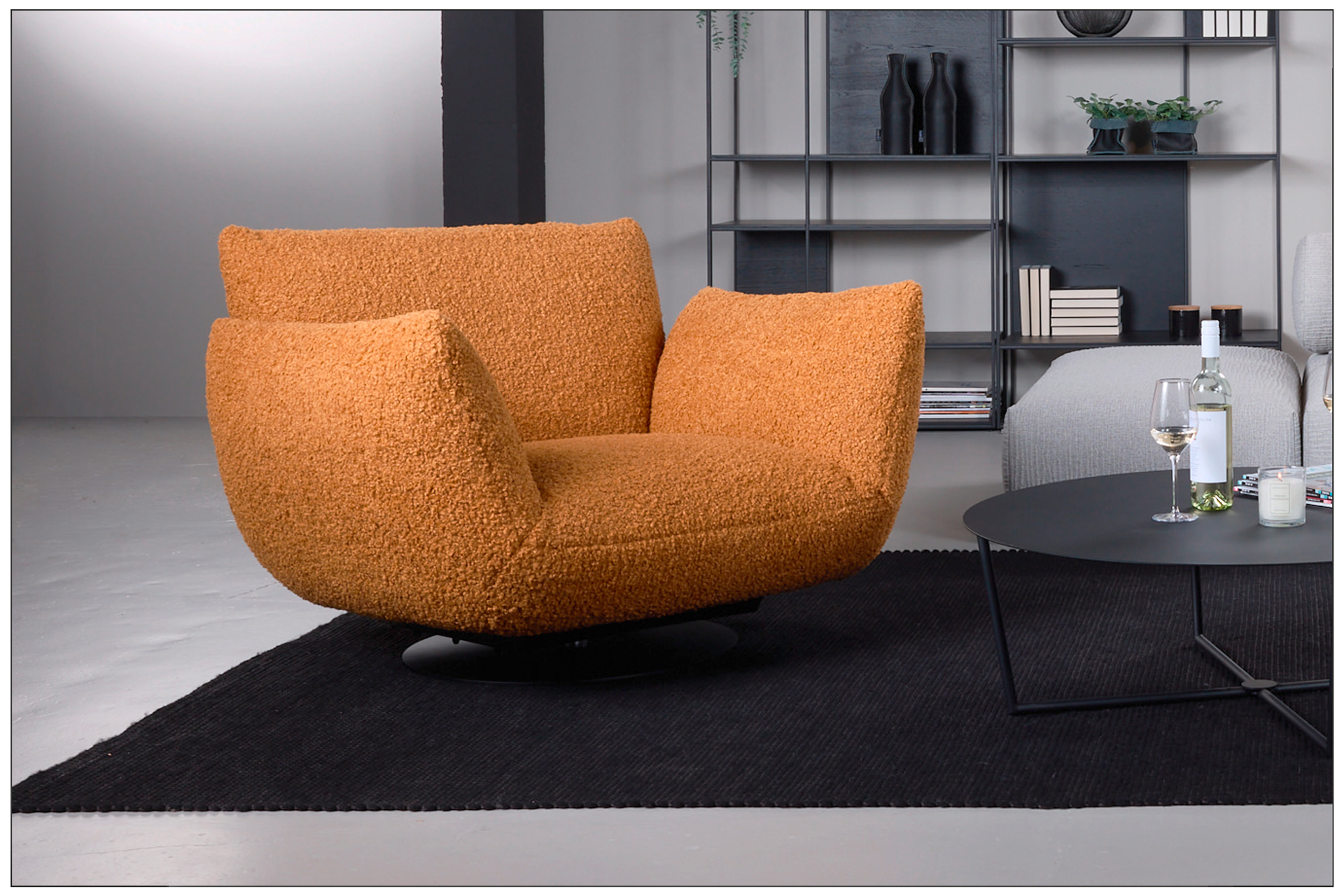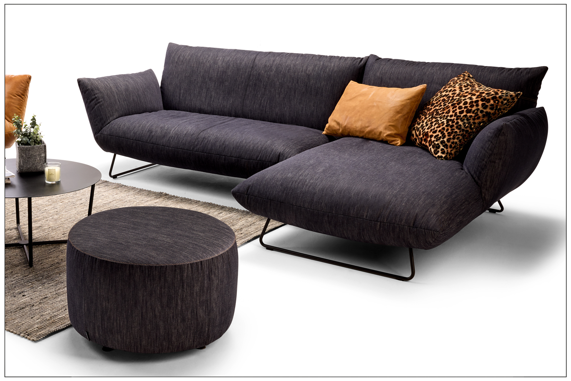 EXTRAVAGANT DESIGN. MAXIMUM COMFORT. PURE RELAXATION. OPTIONALLY AVAILABLE AS A ROTARY AND ROCKING CHAIR, ARMCHAIR, SOFA, LOUNGER AND RECAMIERE. ELEMENTS WITH A CUSHION LOOK ON A METAL BASE FRAME, MATT FINE STRUCTURE POWDER-COATED. LARGE SELECTION OF TEXTILES AND LEATHERS. UNIQUE PIECE PRODUCTION.