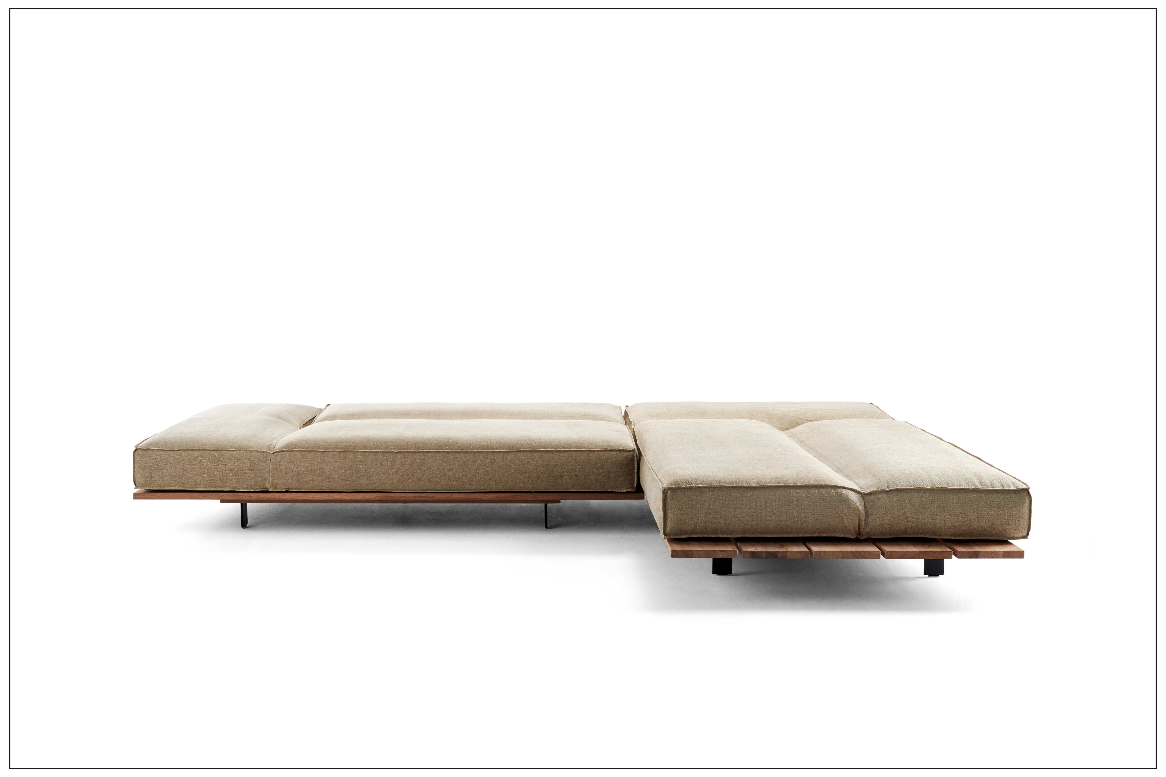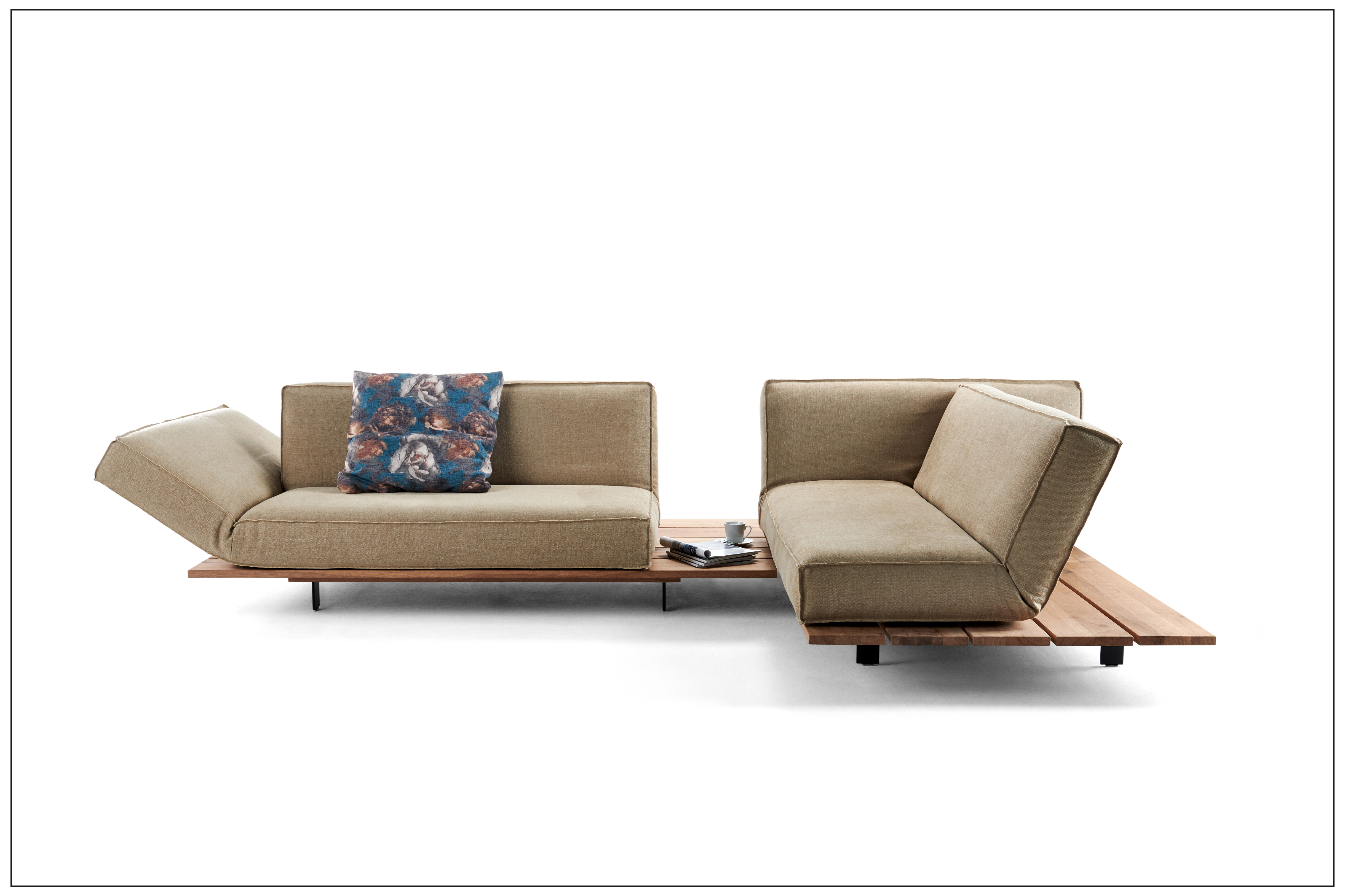 URBAN LIVING. SOFA, COUCH, TABLE - A POWERFUL TRIO FOR AN URBAN LIFESTYLE. EXQUISITE MATERIALS AND MULTIPLE FUNCTIONALITIES DEFINE THE UNIQUE STYLE. UPHOLSTERED UNIT ON A PLATEAU MADE OF SOLID WOOD. BACK AND ARMRESTS CAN BE ADJUSTED IN STEPS TO HORIZONTAL POSITION. AN INTEGRATED STORAGE PLATE IS CREATED BY MANUAL OR MOTOR-DRIVEN LATERAL MOVEMENT OF THE UPHOLSTERY. A WIDE RANGE OF LEATHER, FABRICS AND WOOD COMBINATIONS AS WELL AS SEAM TYPES CAN BE SELECTED. UNIQUE PIECE PRODUCTION.