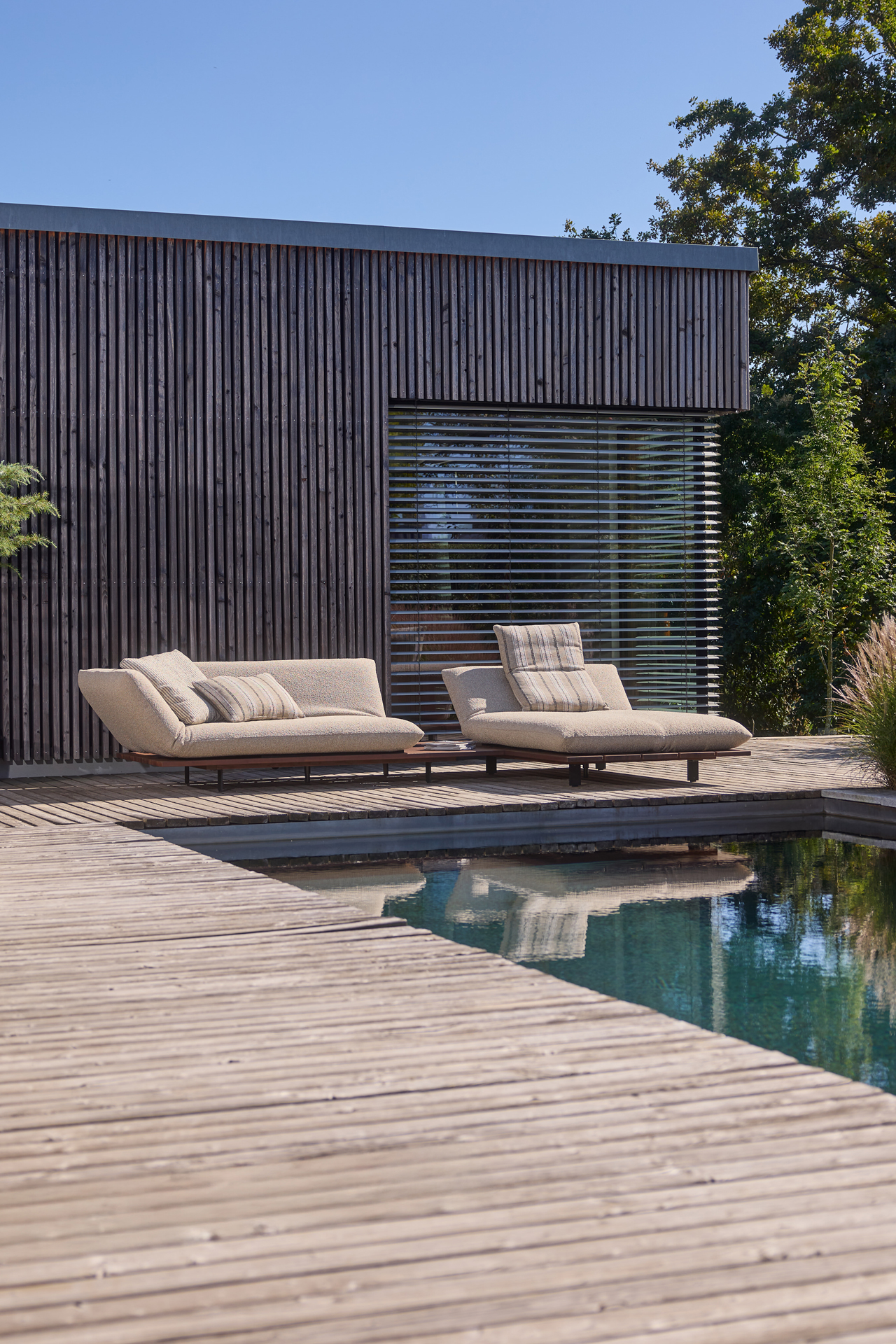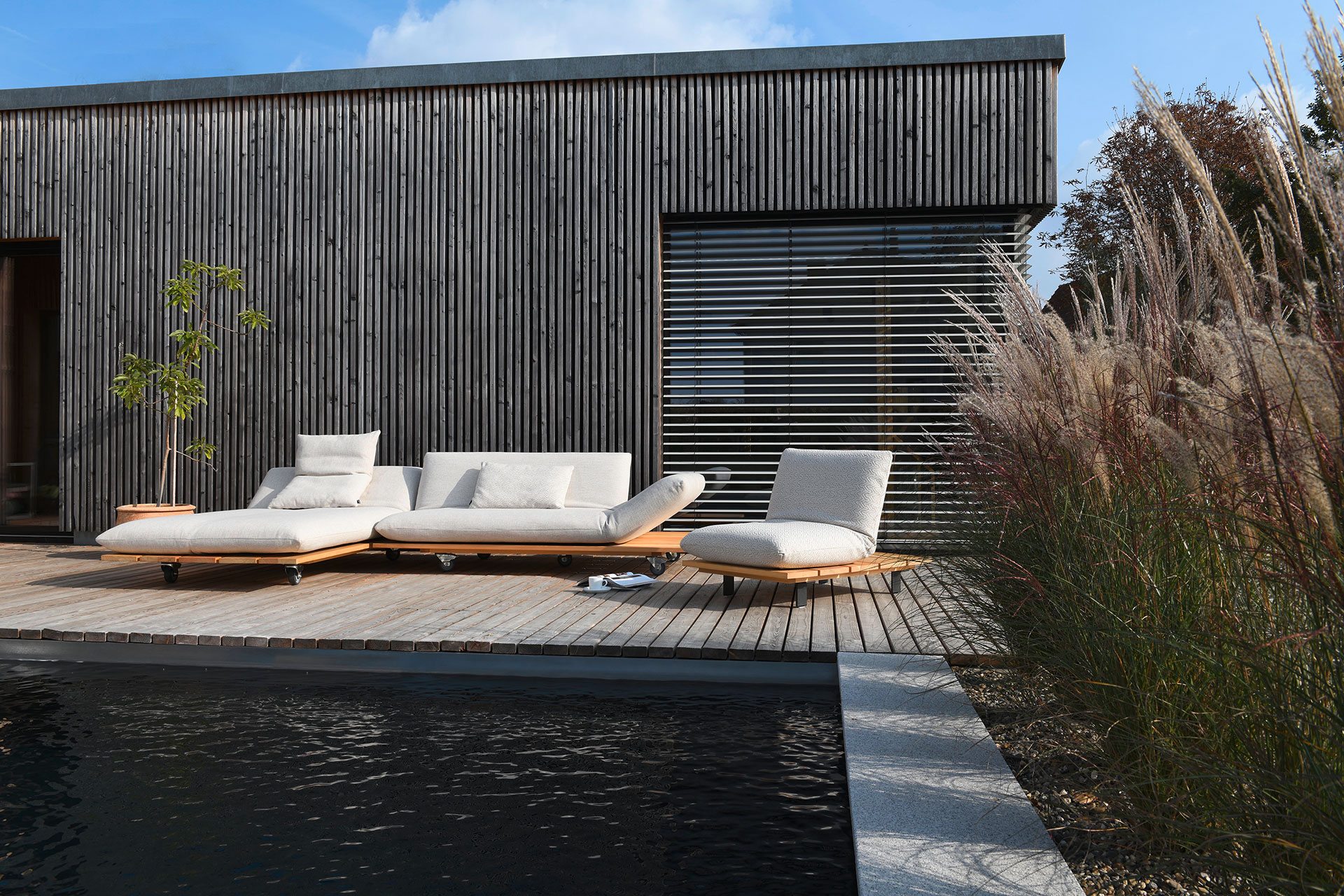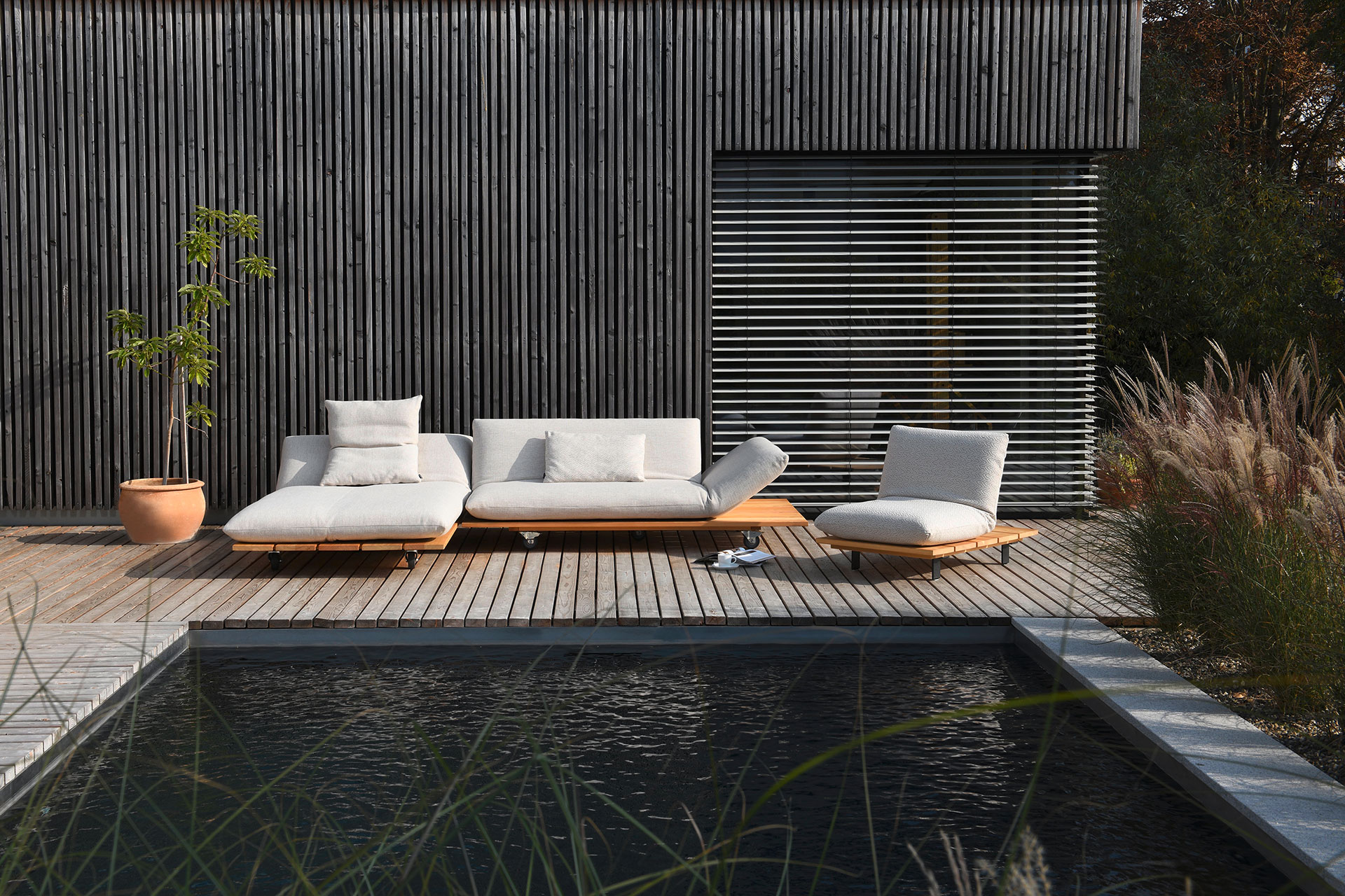 BE UNIQUE. FEEL THE LIGHTNESS OF BEING. CLEAR AND LIGHT DESIGN LINE OFFERING MULTIPLE FUNCTIONS. ELEMENTS MANUALLY MOVEABLE BY 40 cm. EXCEPTIONAL AESTHETICS WITH A SOLID WOOD PLATEAU. INDIVIDUAL TYPE AND SEAM DESIGNS. CHOICE OF DIFFERENT WOOD TYPES AND OUTDOOR FABRICS.ALSO AVAILABLE FOR INDOOR USE. UNIQUE PIECE PRODUCTION.