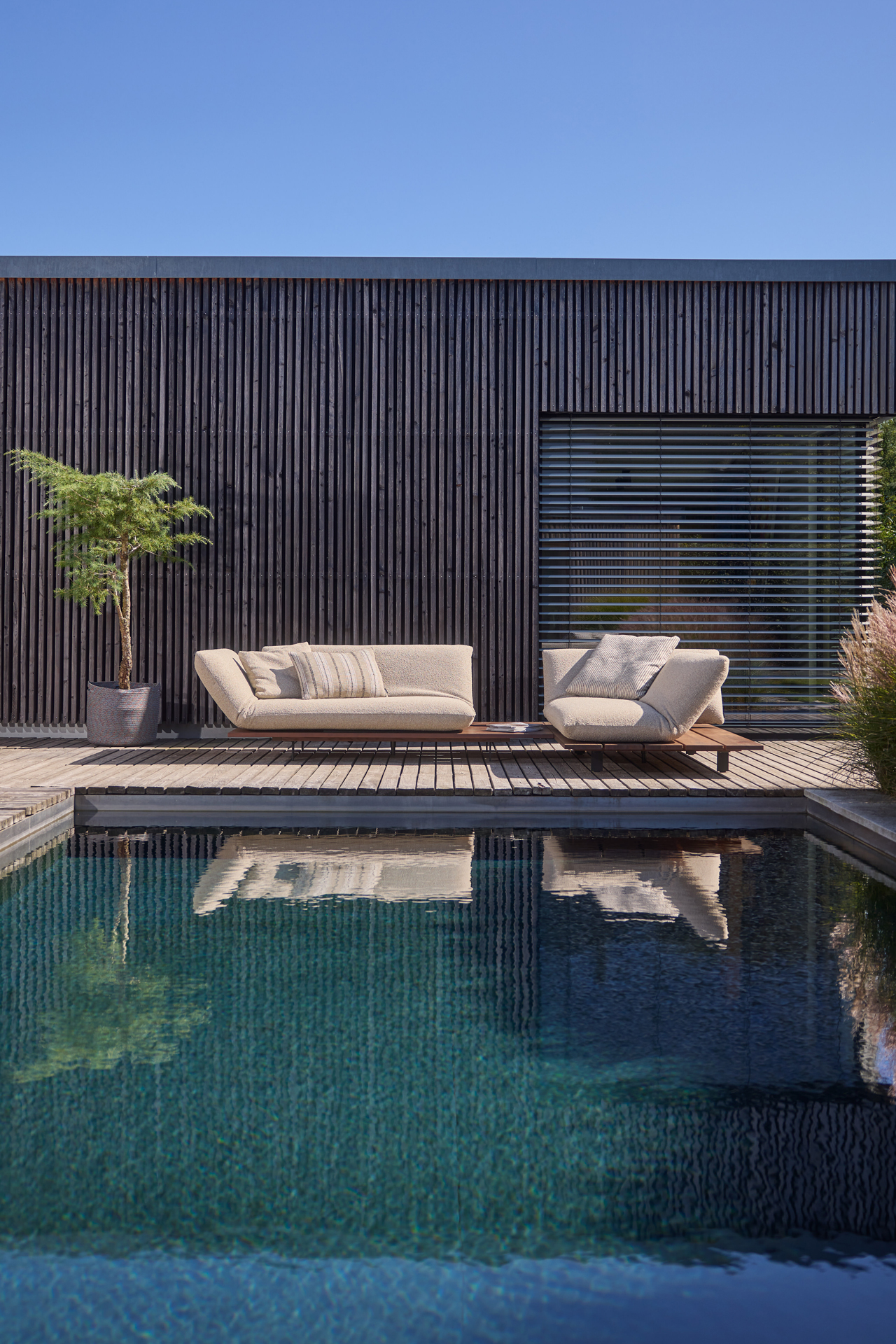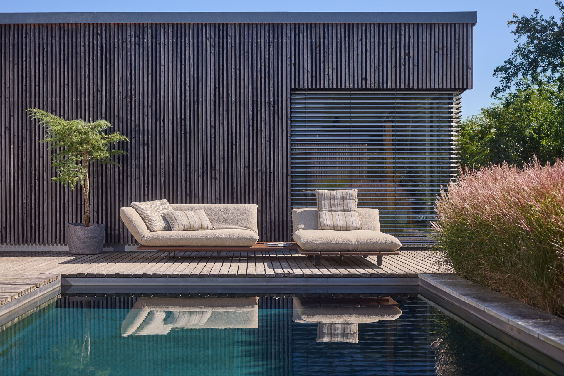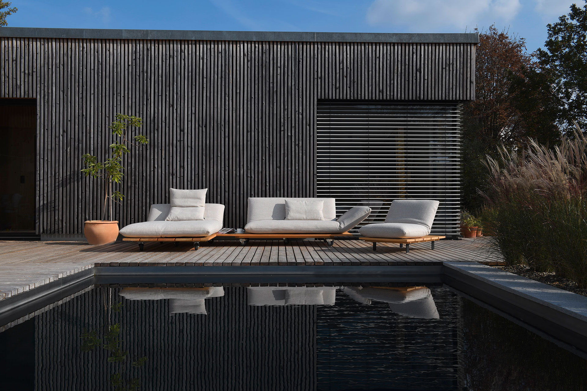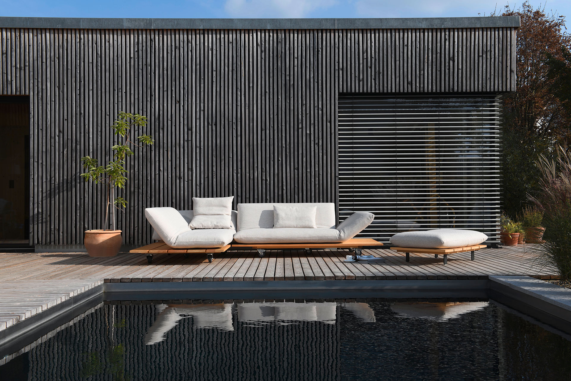 BE UNIQUE. FEEL THE LIGHTNESS OF BEING. CLEAR AND LIGHT DESIGN LINE OFFERING MULTIPLE FUNCTIONS. ELEMENTS MANUALLY MOVEABLE BY 40 cm. EXCEPTIONAL AESTHETICS WITH A SOLID WOOD PLATEAU. INDIVIDUAL TYPE AND SEAM DESIGNS. CHOICE OF DIFFERENT WOOD TYPES AND OUTDOOR FABRICS.ALSO AVAILABLE FOR INDOOR USE. UNIQUE PIECE PRODUCTION.