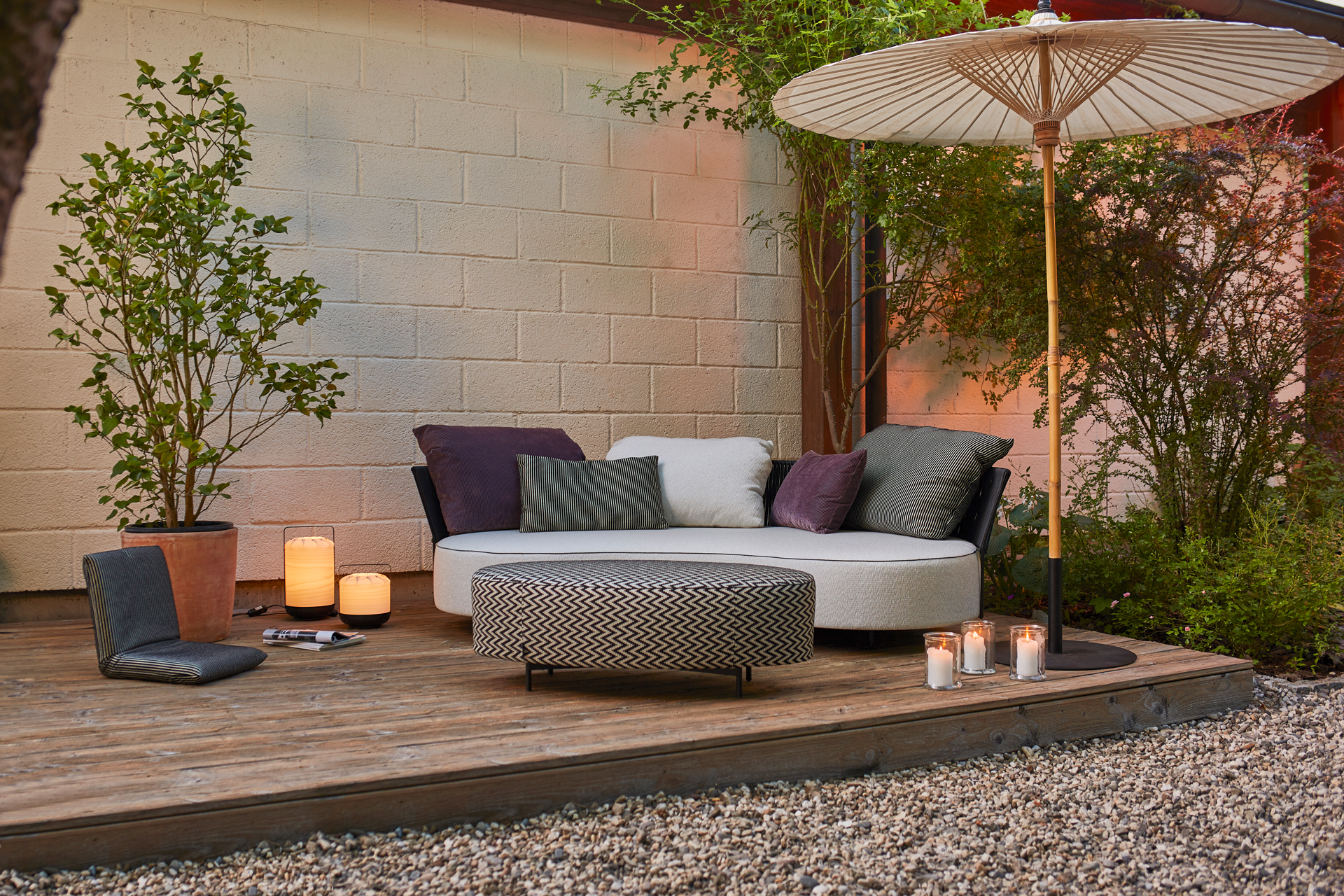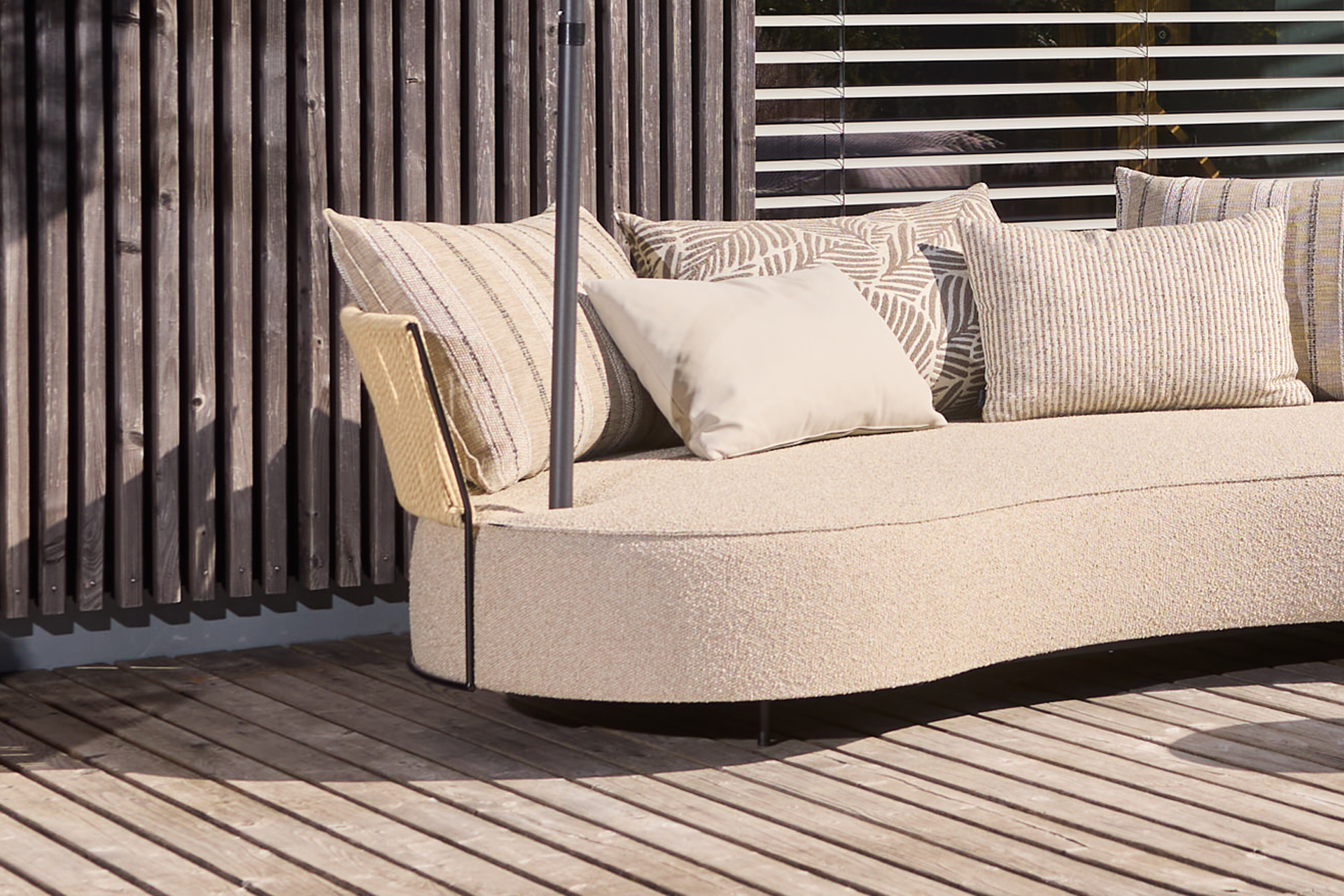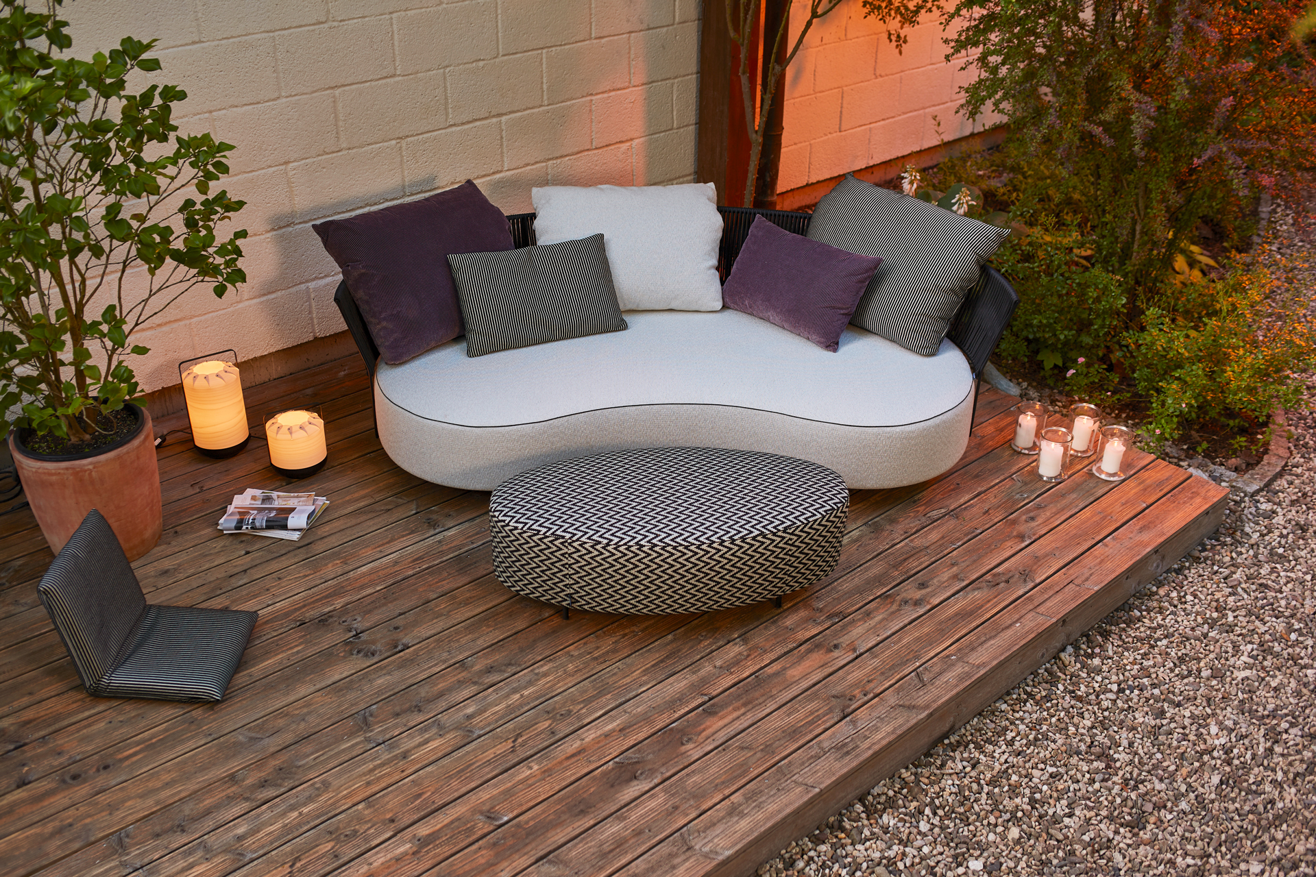 TOUCH THE BREEZE... THE LUXURY OF THE UNUSUAL. A LARGE SOFA WITH A CURVED LINE AND THE AESTHETICS OF SOMETHING SPECIAL. OUTDOOR LOUNGING WITH SUMMERTIME FEELING. THE FILIGREE BACK MADE OF STEEL BRAIDED WITH A TRANSPARENT LOOKING LACING MAKES THIS SOFA TO AN OUTDOOR-MAJESTY. THE OVAL STOOL PART, AS WELL AS DIFFERENT CUSHIONS PROVIDE FOR THE INDIVIDUAL BACK COMFORT. UNIQUE PIECE PRODUCTION.