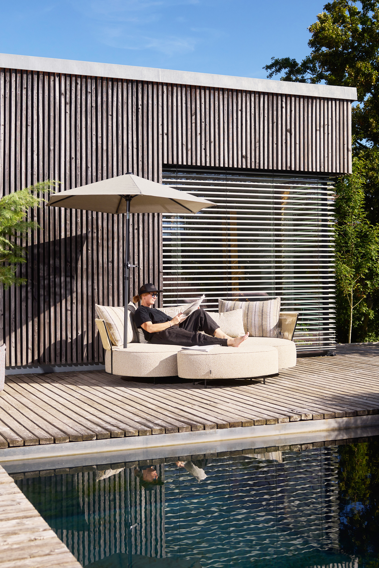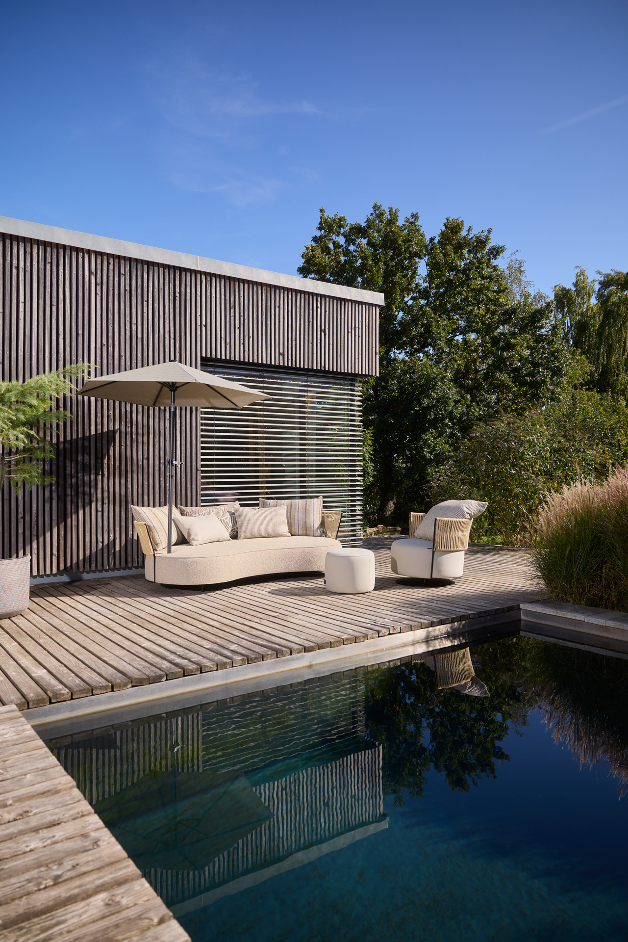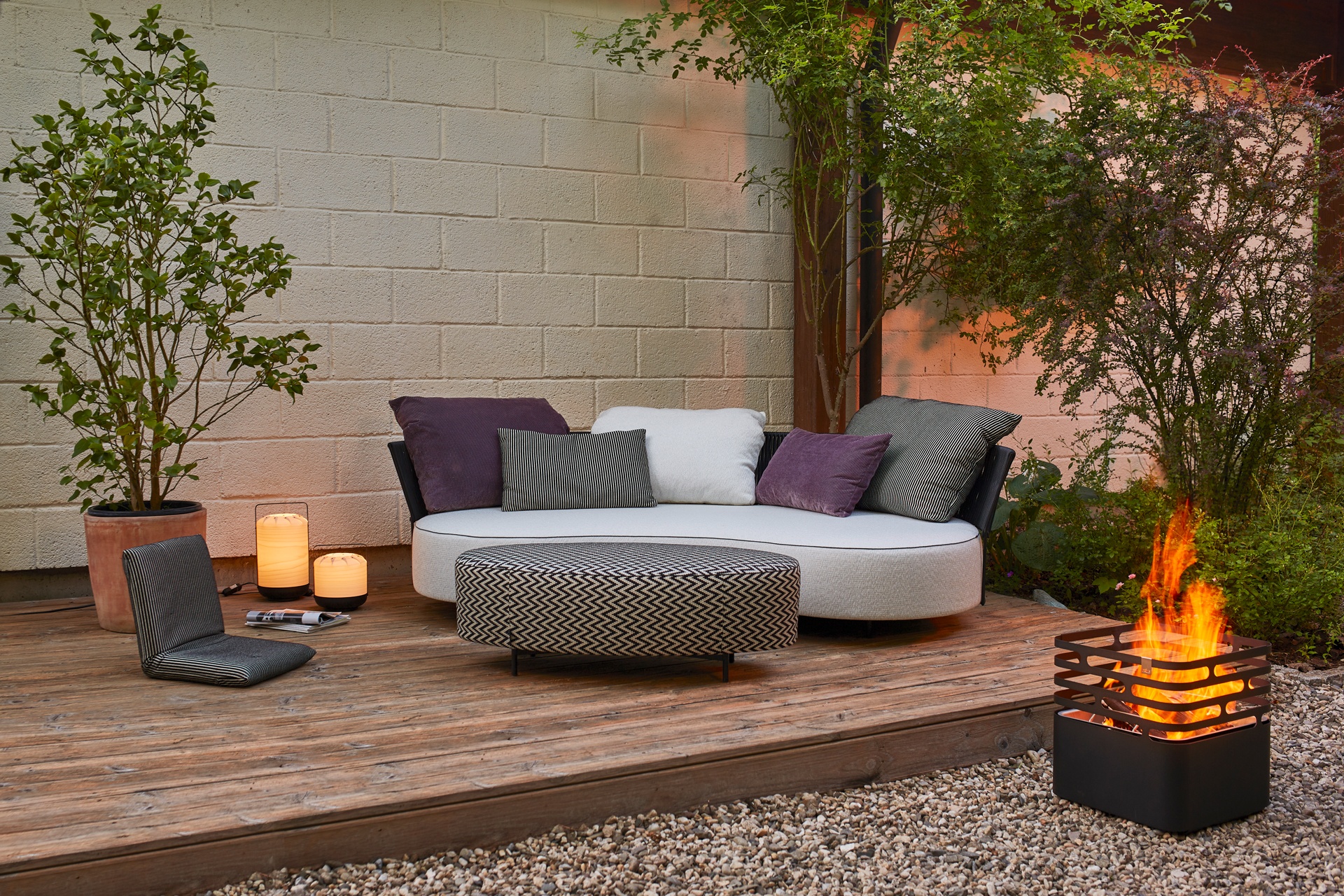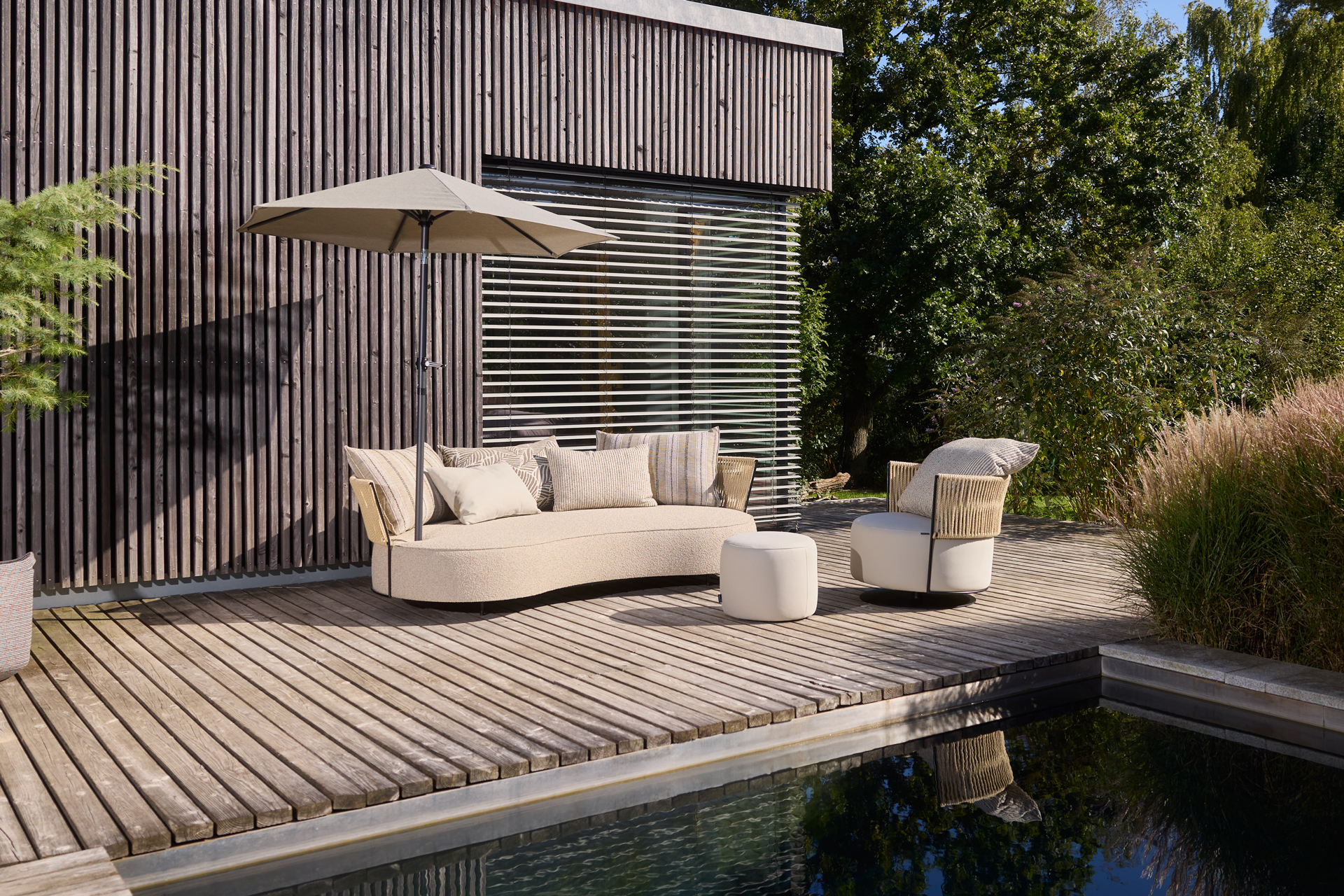 TOUCH THE BREEZE... THE LUXURY OF THE UNUSUAL. A LARGE SOFA WITH A CURVED LINE AND THE AESTHETICS OF SOMETHING SPECIAL. OUTDOOR LOUNGING WITH SUMMERTIME FEELING. THE FILIGREE BACK MADE OF STEEL BRAIDED WITH A TRANSPARENT LOOKING LACING MAKES THIS SOFA TO AN OUTDOOR-MAJESTY. THE OVAL STOOL PART, AS WELL AS DIFFERENT CUSHIONS PROVIDE FOR THE INDIVIDUAL BACK COMFORT. UNIQUE PIECE PRODUCTION.