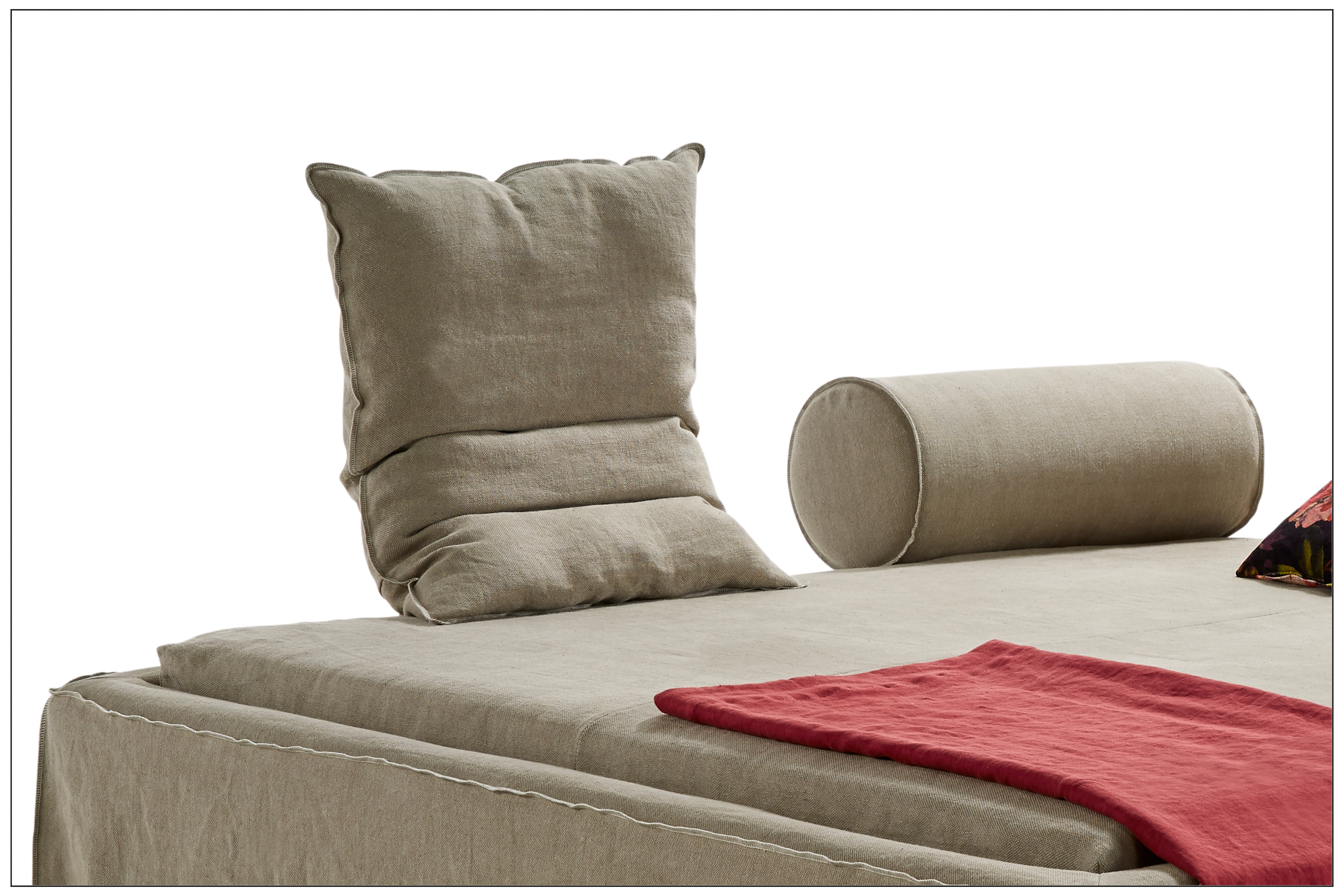 A COMFORTABLE SLEEPING PROGRAMME WITH FUNCTIONAL CUSHION AND PLUG-IN HEAD ROLL FOR A FLEXIBLE DESIGN IN YOUR BEDROOM. THE PROCESSING IN DETAIL OF BOX PLEAT AND OVERCAST SEAM (FABRIC) OR RAW EDGED WORKMANSHIP (LEATHER) GIVES DODO A VERY MODERN LOOK. THE INSERT DEPTH OF SLATTED FRAME IS ADJUSTABLE, THUS THE HEIGHT OF MATRESS CAN BE PROPERLY ADJUSTED. THIS BED IS ALSO SUITABLE FOR BOX SPRING SYSTEMS.
